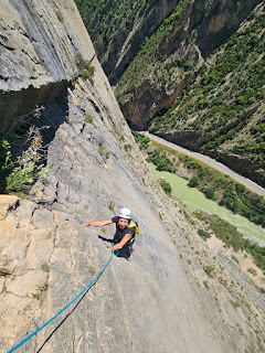 L'endemà anem tots a fer una mica més d'esportiva, busquem un dels pocs sectors a Camarasa que té ombra fins a les 13:30, anem al sector Cingle de la llum i fem les vies Ambapara 6a+ de 25 metres amb una sortida molt dura i fina, que trèiem amb Ao la resta de la via és disfrutona. També fem la seva veïna de la dreta passat el 6c que hi ha entremig de les dues, fem la via Rumba Bella un viote de 6b molt i molt ben parit, amb inici molt finet, però que es fa aguantant la respiració, amb el crux per arribar a la cinquena xapa que trec al segon intent, i una part final desplomada amb molta ganda, apoteòsica.